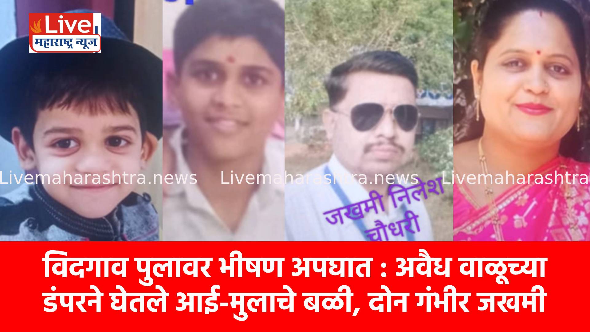 जळगाव-चोपडा मार्गावरील तापी नदीवरील विदगाव पुलावर अवैध वाळू वाहतूक करणाऱ्या भरधाव डंपरने कारला दिलेल्या भीषण धडकेत आई आणि मुलाचा जागीच मृत्यू झाला असून, वडील आणि दुसरा मुलगा गंभीर जखमी झाले आहेत. ही दुर्घटना रविवारी (३० सप्टेंबर) रात्री उशिरा घडली. चौधरी कुटुंब कारमधून चोपडा येथे जात असताना मागून आलेल्या डंपरने त्यांच्या कारला जोरदार धडक दिली. धडकेमुळे कार पुलावरून थेट खाली नदीपात्रातील वाळवंटात जाऊन कोसळली.