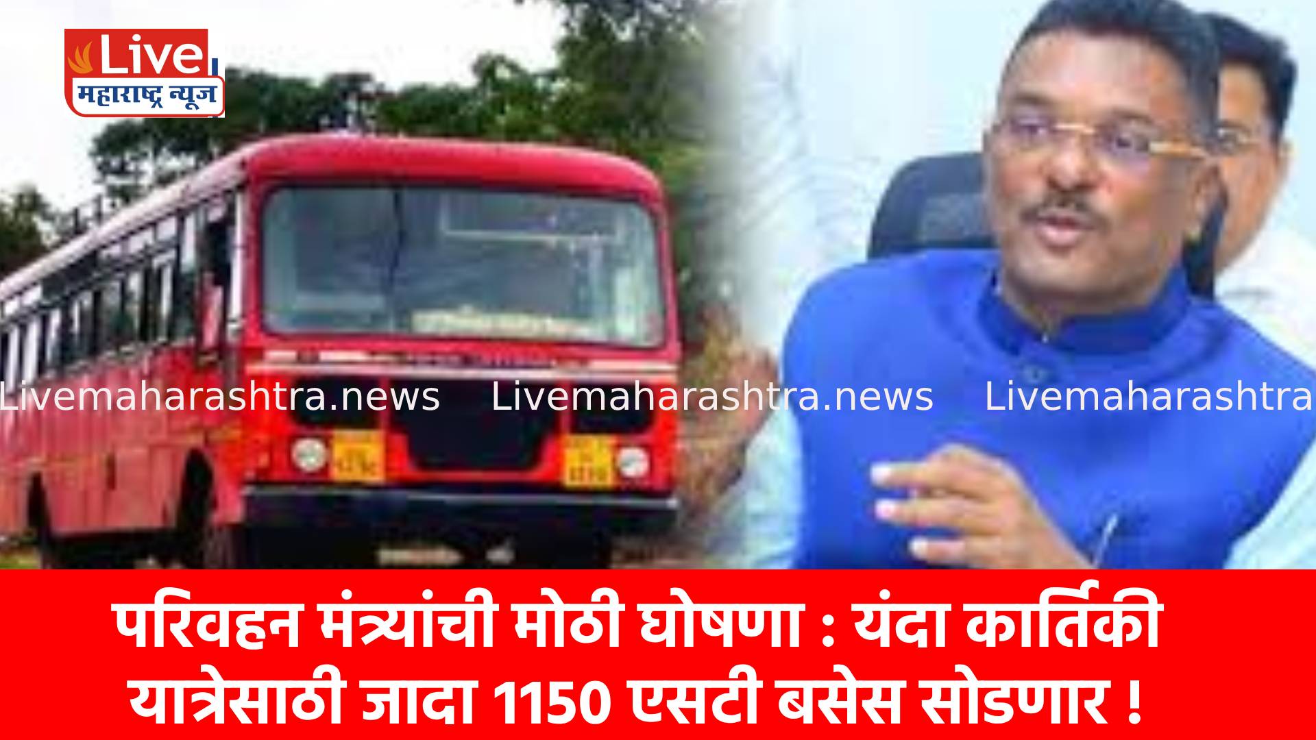 यंदा श्री. क्षेत्र पंढरपूर येथे २ नोव्हेंबर रोजी संपन्न होणाऱ्या कार्तिकी एकादशी यात्रेसाठी भाविक- प्रवाशांच्या सोयीकरता राज्यभरातुन एसटी महामंडळ तब्बल ११५० जादा बसेस सोडण्याची तयारी केली आहे. अशी माहिती परिवहन मंत्री तथा एसटी महामंडळाचे अध्यक्ष श्री. प्रताप सरनाईक यांनी दिली.