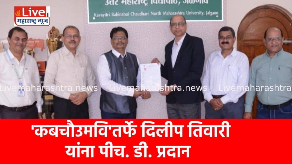 कवयित्री बहिणाबाई चौधरी उत्तर महाराष्ट्र विद्यापिठातर्फे जळगाव येथील ज्येष्ठ पत्रकार दिलीप मनोरमा केशवलाल तिवारी यांना पीएच. डी. पदवी (डॉक्टर ऑफ फिलॉसॉफी अर्थात विद्यावाचस्पती) प्रदान करण्याचे पत्र (नोटीफिकेशन) आज प्रदान करण्यात आले. विद्यापिठाचे कुलगुरू प्रा. विजय माहेश्वरी यांच्या हस्ते श्री. तिवारी यांना याबाबत अधिकृत पत्र प्रदान करण्यात आले. यावेळी प्रकुलगुरू प्रा. एस. टी. इंगळे, व्यवस्थापन परिषद सदस्य राजेंद्र नन्नवरे, मार्गदर्शक प्रा. डाॅ. सुधीर भटकर, संशोधन विभागाचे सहायक कुलसचिव प्रविण चंदनकर, डाॅ. सोमनाथ वडनेरे, सुभाष तळेले उपस्थित होते.