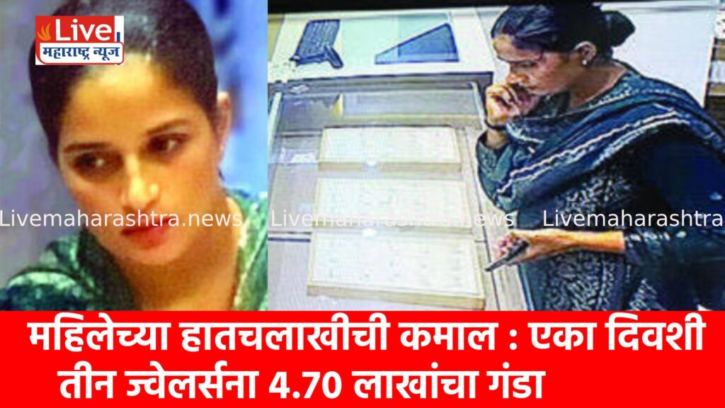 शहरातील तीन नामांकित ज्वेलर्सच्या दुकानांतून एका महिलेने हातचलाखीने तब्बल ४ लाख ७० हजार रुपये किमतीच्या सोन्याच्या अंगठ्या लंपास केल्याची धक्कादायक घटना उघडकीस आली आहे. या प्रकरणी शनिपेठ पोलिस ठाण्यात अज्ञात महिलेविरुद्ध गुन्हा दाखल करण्यात आला असून, तपासात हीच महिला तीन वेगवेगळ्या चोरीच्या घटनांमध्ये सामील असल्याचे समोर आले आहे.