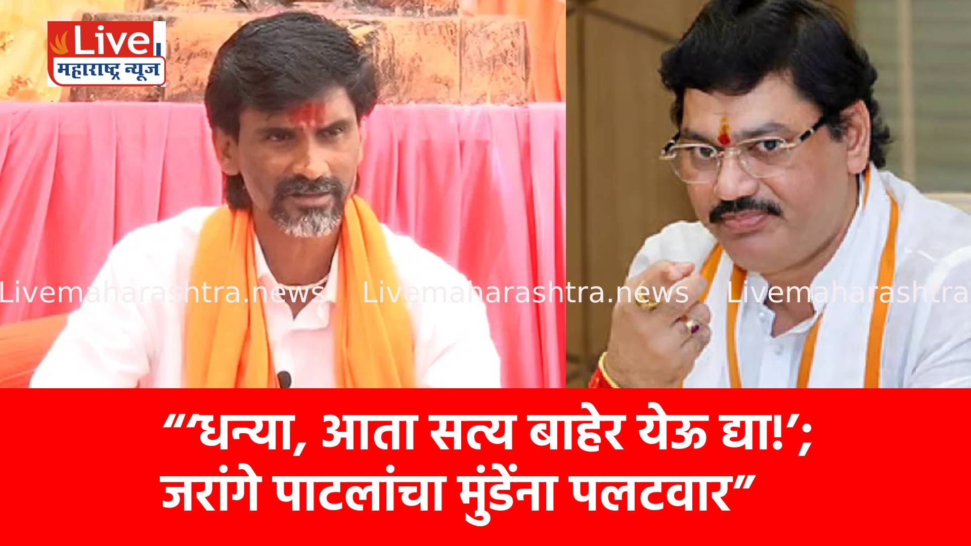 राज्यातील मराठा आरक्षणाच्या नेते मनोज जरांगे पाटील आणि आमदार धनंजय मुंडे यांच्यामध्ये आता पुन्हा एकदा आरोप प्रत्यारोप सुरु जरांगे पाटील यांनी मुंडेंवर घातपाताचे आणि अन्य गंभीर आरोप केले होते. त्यानंतर धनंजय मुंडे यांनी पत्रकार परिषद घेऊन ते आरोप खंडित केले आणि स्वतःची बाजू मांडली. मुंडे म्हणाले की, त्यांचा ब्रेन मॅपिंग आणि नार्को टेस्ट करावी आणि तरीही सत्य बाहेर येत नसेल तर तपास सीबीआयकडे द्यावा. या वक्तव्यांनंतर जरांगे पाटीलही थेट माध्यमांसमोर येऊन पलटवार केला; त्यांनी धनंजय मुंडे यांना धन्या, म्हणून संबोधत ऑडिओ क्लिप ऐकवली आणि त्यातले पुरावे दाखवले.