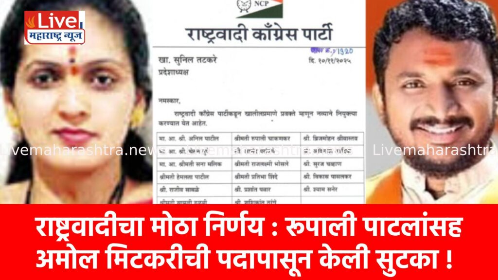 गेल्या काही दिवसांपासून वेगवेगळ्या मुद्यांवर बेधडक विधाने करून स्वपक्षाची राजकीय कोंडी करणाऱ्या रूपाली पाटील व आमदार अमोल मिटकरी यांची राष्ट्रवादी काँग्रेसच्या प्रवक्ते पदावरून हकालपट्टी करण्यात आली आहे. रूपाली पाटील यांनी राज्य महिला आयोगाच्या अध्यक्ष रूपाली चाकरणकर यांच्यावर तिखट हल्ला चढवला होता. तर मिटकरी यांच्या विधानांमुळे सत्ताधारी महायुतीत तणाव निर्माण होताना दिसून येत होता. परिणामी राष्ट्रवादी काँग्रेसने या दोघांनाही प्रवक्ते पदावरून दूर करून स्वतःची सुटका करून घेण्याचा प्रयत्न केला.