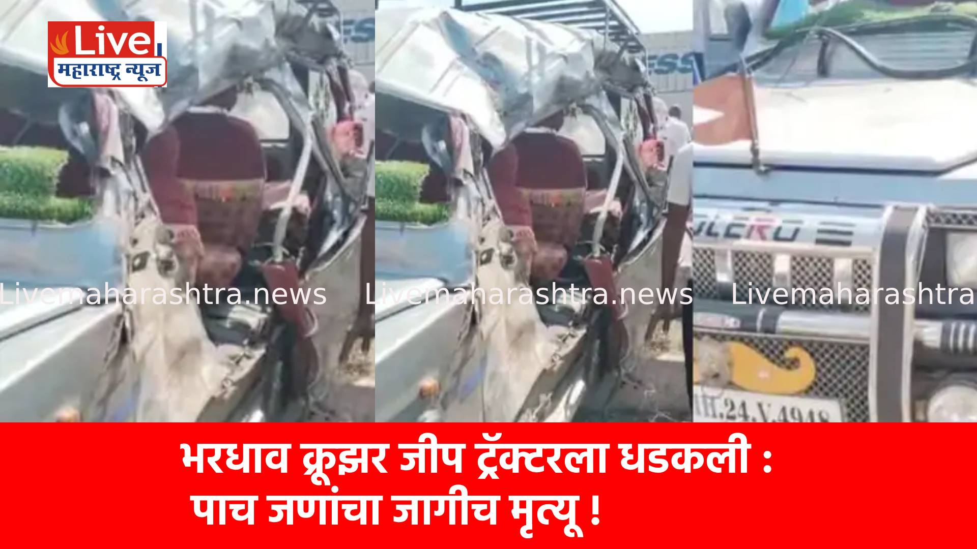 मिळालेल्या माहितीनुसार, धाराशिव जिल्ह्यातील सोलापूर – हैदराबाद महामार्गावरून शनिवारी सकाळी एक क्रूझर जीप भरधाव वेगात जात होती. या गाडीतील प्रवाशी सोलापूरहून नळदुर्ग येथे देवदर्शनासाठी जात होते. ही क्रूझर धाराशिवच्या अणदूर परिसरात आली असताना अचानक तिचे टायर फुटले. यामुळे चालकाचे वाहनावरील नियंत्रण सुटून क्रूझर रस्त्यात उभ्या असणाऱ्या एका ट्रॅक्टरला धडकली. त्यानंतर ती रस्त्यावरच उलटली. या घटनेत 5 जणांचा जागीच मृत्यू झाला. मृतांत 3 महिलांचा समावेश आहे. क्रूझरमधील इतर 8 जणही या अपघातात गंभीर जखमी झालेत. त्यांना उपचारासाठी सोलापूर स्थित शासकीय रुग्णालयात हलवण्यात आले आहे.