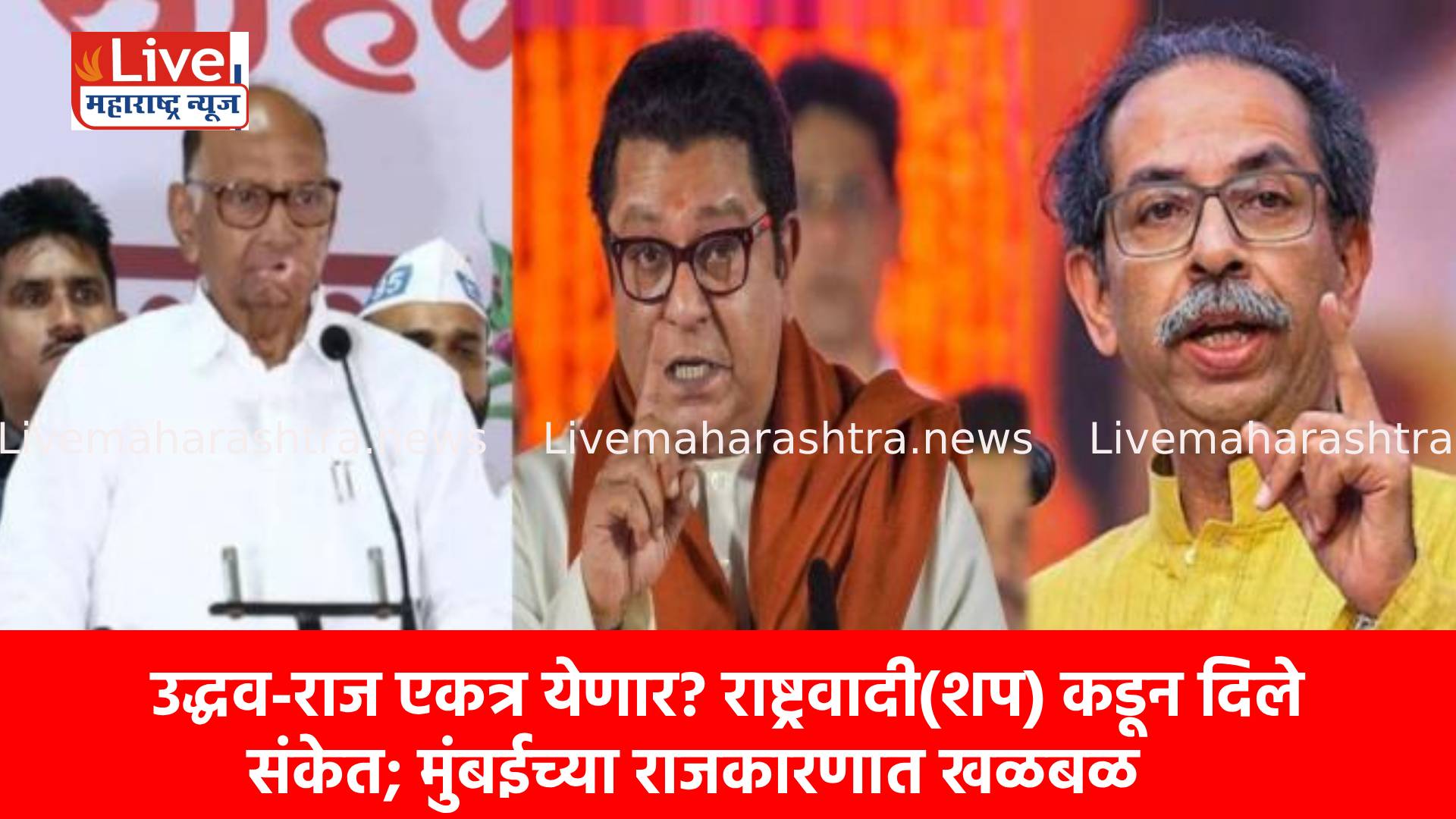 राज्याच्या राजकारणातील एक महत्वाची बातमी समोर आली आहे. राष्ट्रवादी काँग्रेस(शप) पक्षाने आगामी मुंबई महानगरपालिका निवडणुकीत शिवसेना (उबाठा) प्रमुख उद्धव ठाकरे आणि मनसे प्रमुख राज ठाकरे यांच्याशी युती करण्याचे संकेत दिले आहेत. मुंबईत शरद पवारांच्या नेतृत्त्वाखाली राष्ट्रवादी काँग्रेसची महत्त्वाची बैठक पार पडली.