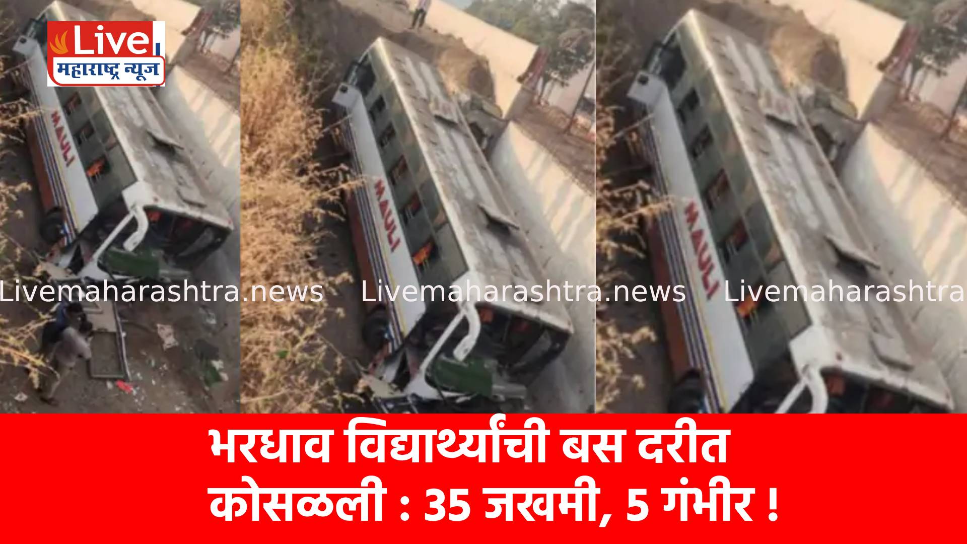 कोकण सहलीवरून नाशिकला परतणाऱ्या विद्यार्थ्यांच्या बसला मंगळवारी पहाटे पुणे–बंगळुरू महामार्गावर अपघात झाला. बस 20 फूट खोल दरीत कोसळली असून 30 ते 35 विद्यार्थी आणि शिक्षक जखमी झाले आहेत. यापैकी 5 विद्यार्थ्यांची प्रकृती गंभीर असून त्यांच्यावर कराड येथील कृष्णा रुग्णालयात उपचार सुरू आहेत.