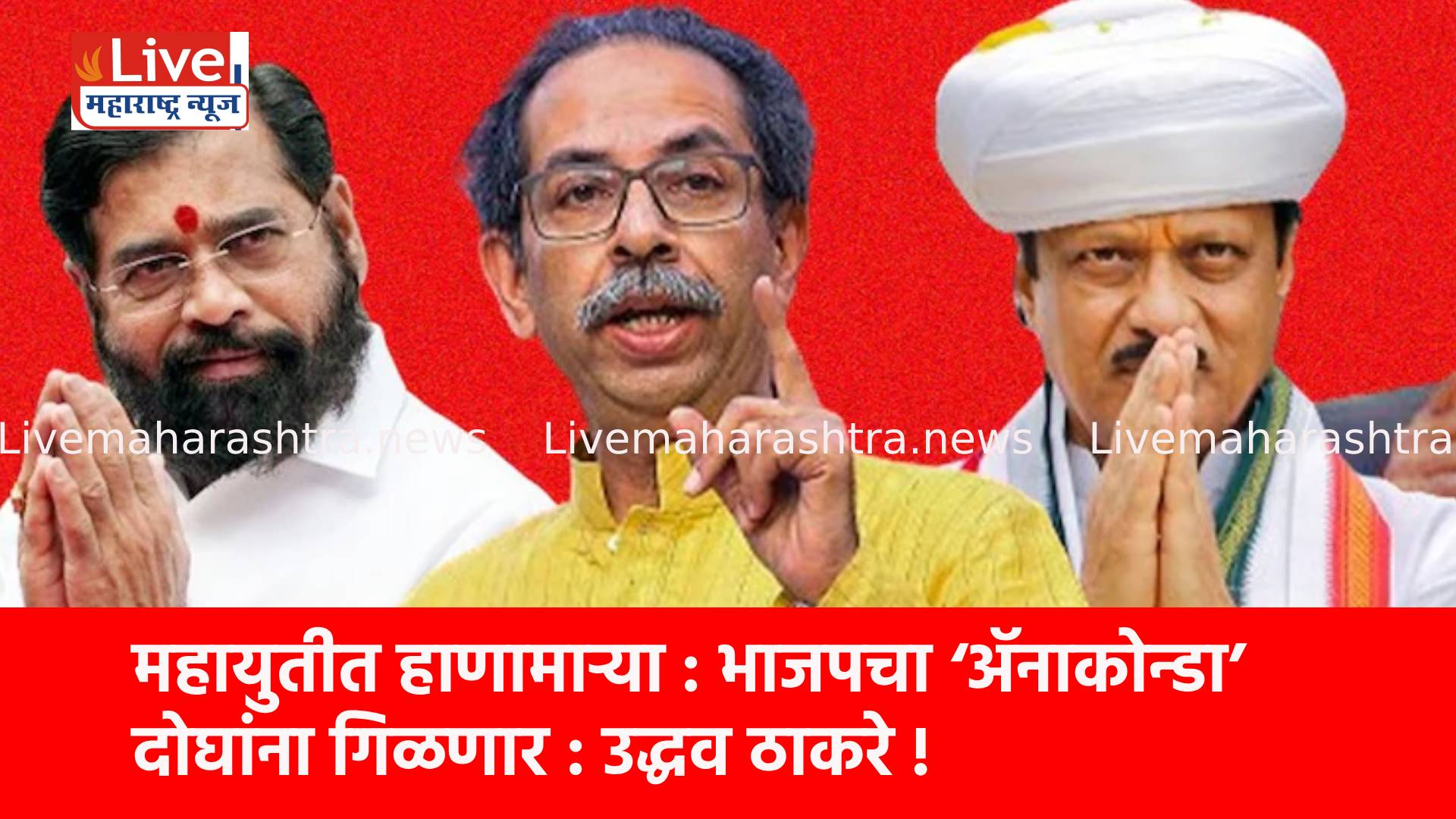 राज्यातील महायुतीमधील घटकपक्षांमध्ये सध्या हाणामाऱ्या सुरू आहेत. भाजपच्या दोन्ही मित्रपक्षांच्या नाव व निशाण्या वेगळ्या असल्या तरी त्यांचा मालक एकच आहे. त्यामुळे भाजपचा ॲॅनाकोंडा या दोन्ही पक्षांना गिळल्याशिवाय राहणार नाही, अशा शब्दांत शिवसेना उद्धव बाळासाहेब ठाकरे पक्षाचे पक्षप्रमुख उद्धव ठाकरे यांनी शनिवारी महायुतीवर निशाणा साधला.