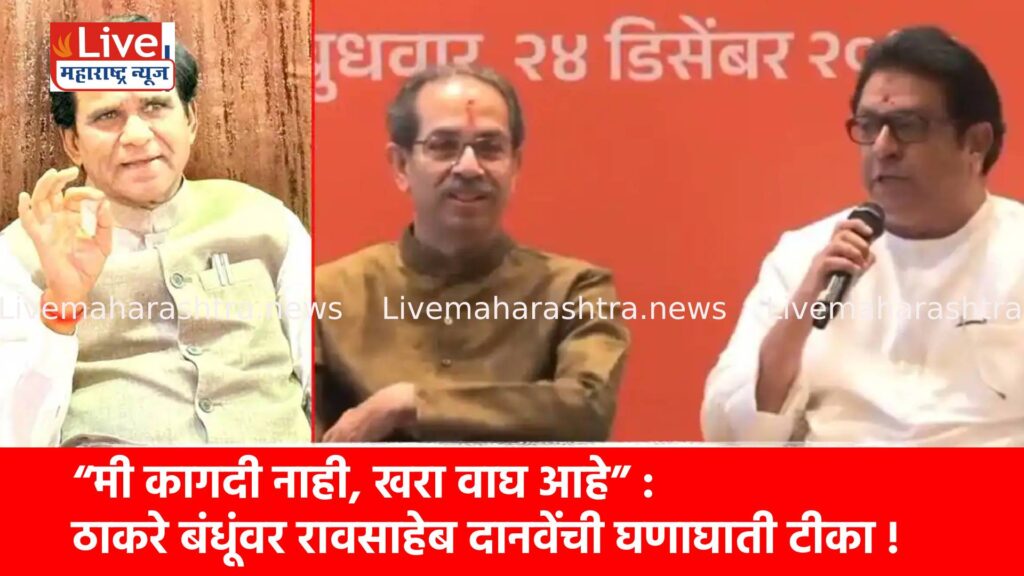 भाजप नेते तथा माजी केंद्रीय मंत्री रावसाहेब दानवे यांनी ठाकरे बंधूंवर जोरदार शब्दांत टीका करत राज ठाकरे यांच्या टोमण्याला सडेतोड प्रत्युत्तर दिले आहे. “मी ठाकरे बंधूंप्रमाणे कागदी वाघ नाही, तर खरा वाघ आहे. मी डरकाळ्या मारत विधानसभा आणि लोकसभेत गेलो आहे,” असे म्हणत दानवेंनी राजकीय वातावरण तापवले आहे.