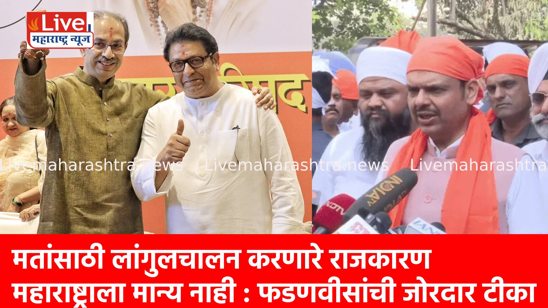 राज्यात ठाकरे बंधूंच्या संभाव्य युतीच्या चर्चांमुळे राजकीय वातावरण तापले असतानाच मुख्यमंत्री देवेंद्र फडणवीस यांनी या युतीवर जोरदार आणि आक्रमक शब्दांत टीका केली आहे. ठाकरे बंधूंचे सध्याचे राजकारण हे केवळ मतांसाठी केले जाणारे लांगुलचालन असून, त्यातून त्यांच्या विचारधारेची घसरण स्पष्टपणे दिसून येत असल्याचा आरोप फडणवीस यांनी केला.