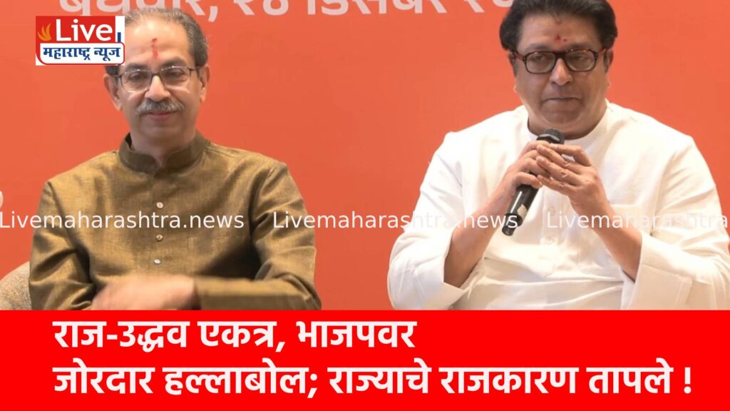 भाजपावर आरोपांची झोड उठवत उद्धव ठाकरे म्हणाले की, भाजपाने केवळ युती तोडलेली नाही तर शिवसेना संपवण्याचा डाव रचला आहे. “माझा एकही माणूस फुटता कामा नये. महाराष्ट्राच्या भल्यासाठी मी वाईट ठरलो तरी चालेल, पण निष्ठा विकू नका,” असे आवाहन त्यांनी कार्यकर्त्यांना केले. महापालिका निवडणुकांच्या पार्श्वभूमीवर ठाकरे बंधूंची एकजूट, मराठी अस्मितेचा मुद्दा आणि भाजपविरोधातील आक्रमक भूमिका यामुळे येत्या काळात राज्यातील राजकीय लढत अधिकच रंगतदार होणार असल्याचे स्पष्ट संकेत मिळत आहेत.