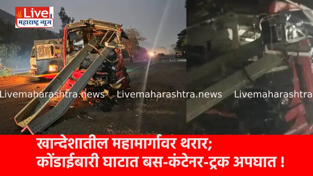 नवापूर तालुक्यातील कोंडाईबारी घाटात पोलिस चौकीजवळ राष्ट्रीय महामार्गावर भीषण अपघात झाला. रस्त्यावर उभ्या असलेल्या बसला मागून भरधाव कंटेनरने जोरदार धडक दिल्याने बस समोर उभ्या असलेल्या ट्रक आणि कंटेनरच्या मधोमध अक्षरशः चिरडली गेली. या भीषण अपघातात बसचा पुढील भाग पूर्णतः उद्ध्वस्त झाला. अपघात इतका जबरदस्त होता की कंटेनरच्या धडकेत बसची केबिन चेंदामेंदा झाली. ट्रकचा अँगल थेट बसमध्ये घुसल्याने बसचे लोखंडी भाग वाकडे-तिडके झाले असून घटनास्थळावरील दृश्य अंगावर काटा आणणारे होते.