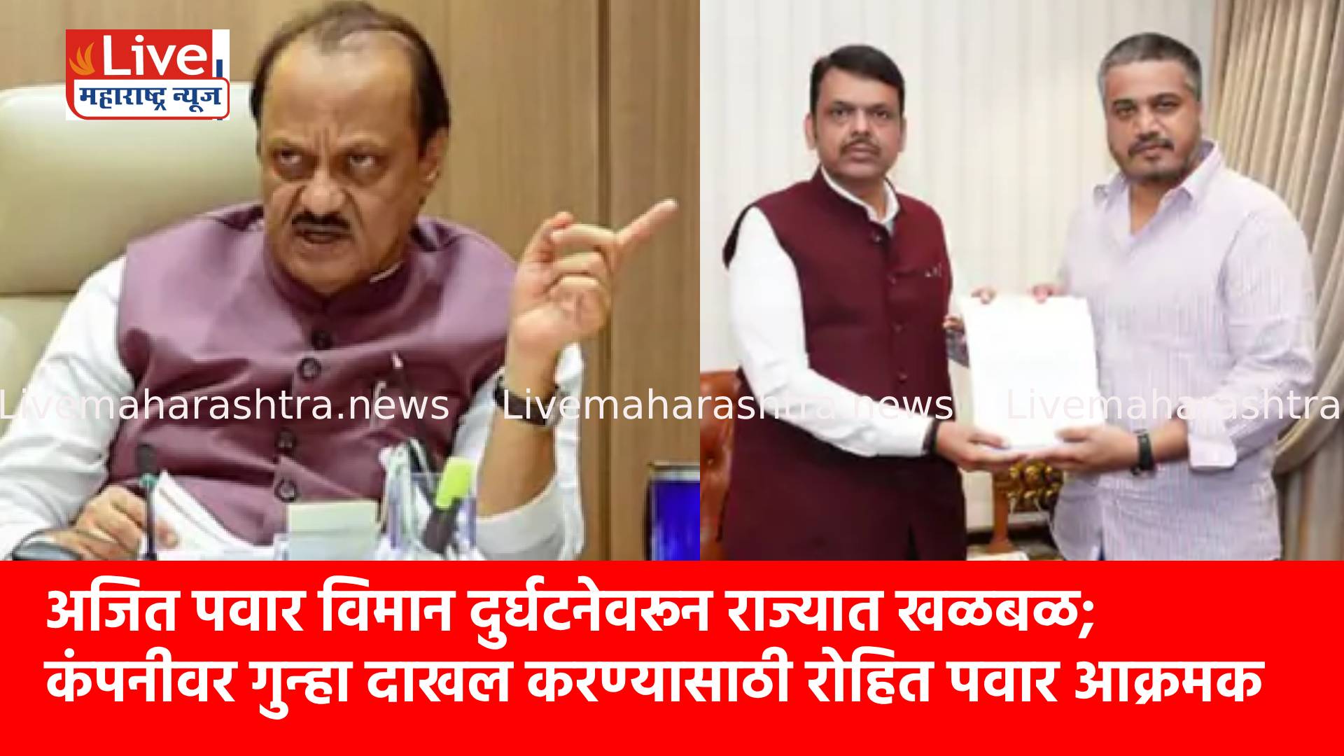 राष्ट्रवादी काँग्रेसचे दिवंगत नेते अजित पवार यांच्या विमान दुर्घटनेप्रकरणी चौकशी सुरू असताना या घटनेला नवे राजकीय वळण मिळाले आहे. कंपनीवर तात्काळ गुन्हा दाखल करावा, अशी ठाम मागणी आमदार रोहित पवार यांनी केली आहे. यासाठी त्यांनी युगेंद्र पवार व कार्यकर्त्यांसह बारामती पोलिस ठाण्यात जाऊन तक्रार नोंदवण्याचा प्रयत्न केला. मात्र पोलिसांनी गुन्हा दाखल करण्यास नकार दिल्याने त्यांनी नाराजी व्यक्त केली.