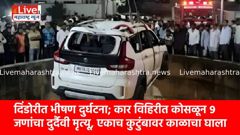 नाशिक जिल्ह्यातील दिंडोरी तालुक्यात अत्यंत हृदयद्रावक अपघात घडला असून, पाण्याने भरलेल्या विहिरीत कार कोसळल्याने नऊ जणांचा जागीच मृत्यू झाला आहे. या दुर्घटनेमुळे संपूर्ण परिसरात शोककळा पसरली असून, एकाच कुटुंबातील पाच जणांचा मृत्यू झाल्याने हळहळ व्यक्त केली जात आहे.