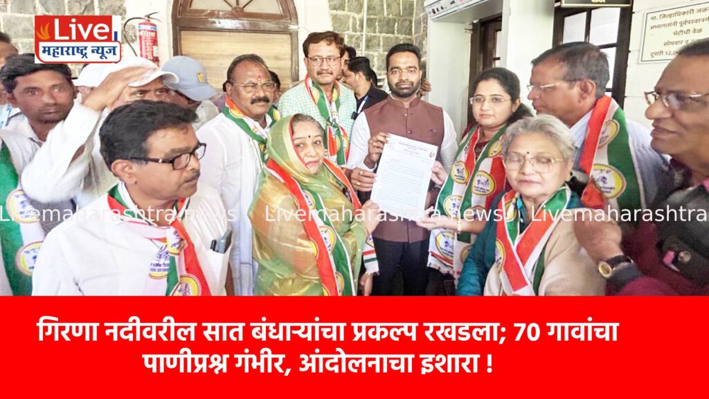 गिरणा नदीवरील सात साखळी बंधाऱ्यांच्या महत्त्वाकांक्षी प्रकल्पाला शासनाने मान्यता देऊनही पुढील कार्यवाही न झाल्याने जळगाव जिल्ह्यातील ६० ते ७० गावांतील पिण्याच्या पाण्याचा प्रश्न अधिकच गंभीर बनला आहे. या पार्श्वभूमीवर राष्ट्रवादी काँग्रेस (शरद चंद्र पवार गट) महिला जिल्हाध्यक्ष कल्पिता रमेश पाटील यांच्या नेतृत्वाखाली प्रशासनाला निवेदन देत तातडीने प्रकल्प सुरू करण्याची मागणी करण्यात आली आहे.