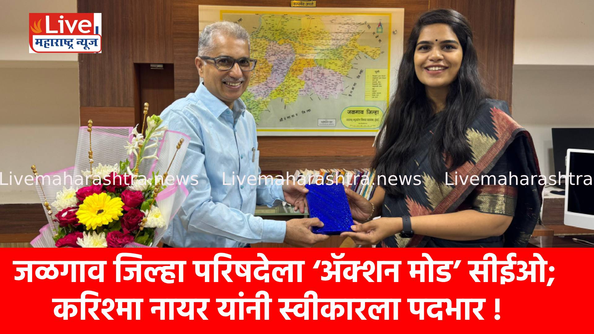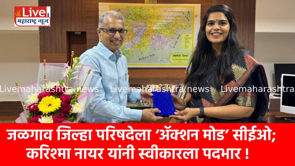 जळगाव जिल्हा परिषदेच्या नवनियुक्त मुख्य कार्यकारी अधिकारी करिश्मा नायर यांनी शुक्रवार, दि. १० एप्रिल रोजी पदभार स्वीकारला. जिल्हा परिषदेचे अतिरिक्त मुख्य कार्यकारी अधिकारी रणधीर सोमवंशी यांच्या हस्ते त्यांना पदभार देण्यात आला. यावेळी जिल्हा परिषदेचे सर्व विभाग प्रमुख उपस्थित होते.