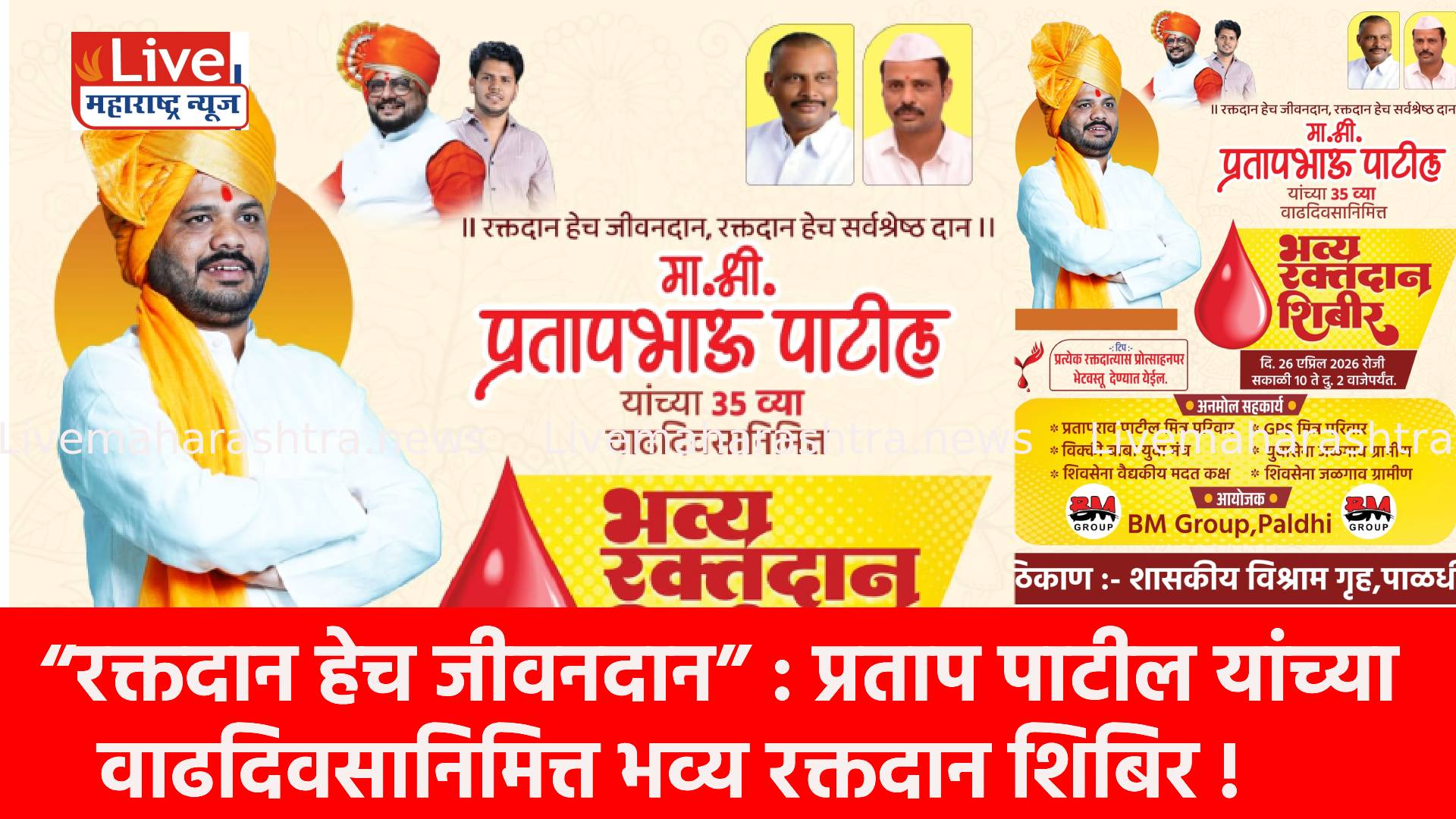 समाजोपयोगी उपक्रमांची परंपरा जपत माजी जि. प. सदस्य प्रताप पाटील यांच्या ३५ व्या वाढदिवसानिमित्त रविवारी, दि. २६ एप्रिल २०२६ रोजी पाळधी येथे भव्य रक्तदान शिबिराचे आयोजन करण्यात आले आहे. “रक्तदान हेच जीवनदान, रक्तदान हेच सर्वश्रेष्ठ दान” या संदेशाला केंद्रस्थानी ठेवून हा उपक्रम राबविण्यात येणार आहे.